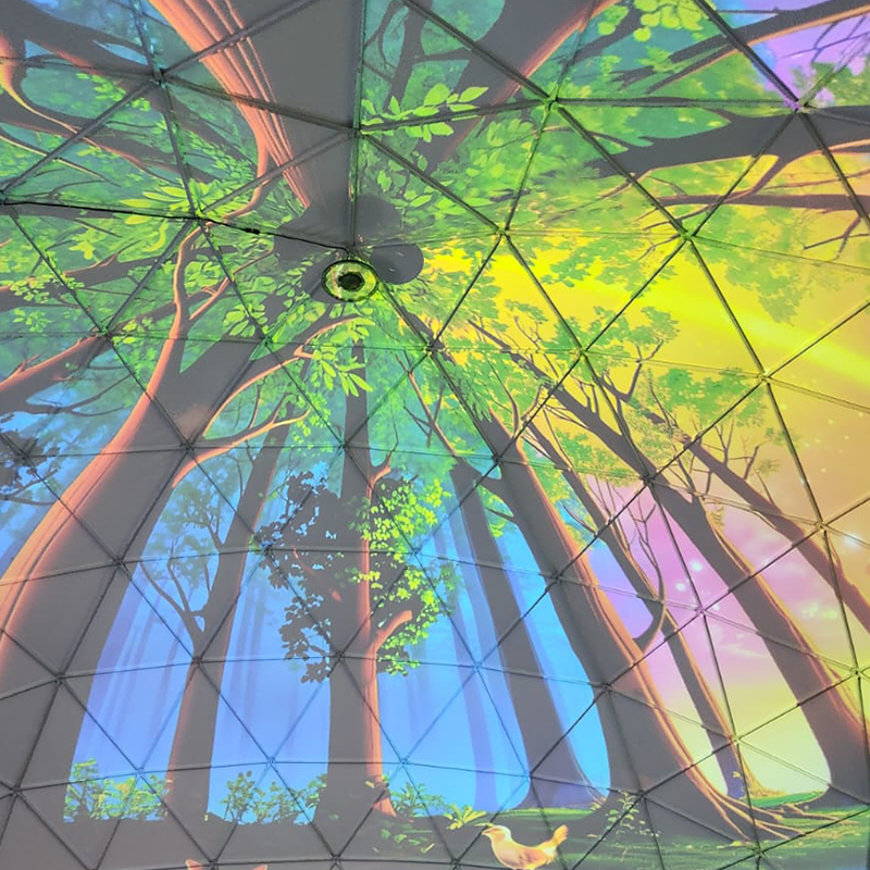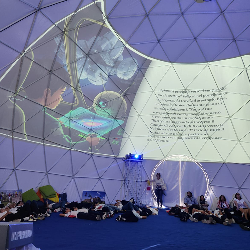 Realizzata per l’evento NextGen AI, l’installazione immersiva trasforma una cupola in un universo narrativo dedicato a grandi e piccoli, dove tecnologia e immaginazione si incontrano. Quattro videoproiettori sincronizzati avvolgono lo spazio a 360°, creando un ambiente visivo continuo in cui foreste incantate, cieli stellati, castelli sospesi e creature fantastiche prendono vita sopra e intorno al pubblico. Le immagini scorrono senza interruzioni lungo la superficie emisferica, mentre un paesaggio sonoro immersivo guida gli spettatori in un viaggio attraverso il mondo delle fiabe. L’intelligenza artificiale diventa qui strumento poetico: genera scenari dinamici, trasforma le narrazioni in ambienti visivi pulsanti e costruisce un ponte tra tradizione e innovazione. All’interno della cupola, bambini e adulti condividono la stessa meraviglia: non più semplici spettatori, ma protagonisti di un racconto collettivo. “NextGen Dreams – Fiabe in Cupola” invita a riscoprire il potere delle storie nell’era digitale, dove l’AI amplifica la fantasia e rende ogni fiaba un’esperienza immersiva e partecipata.